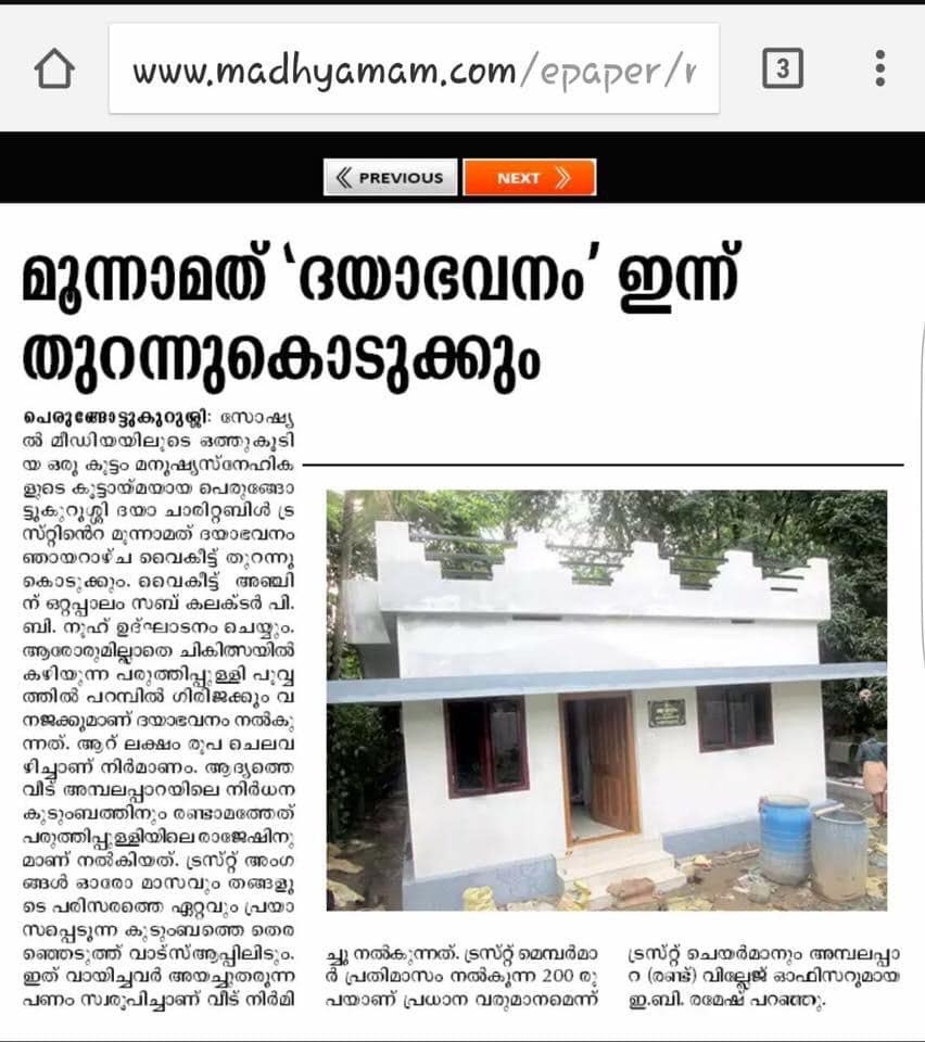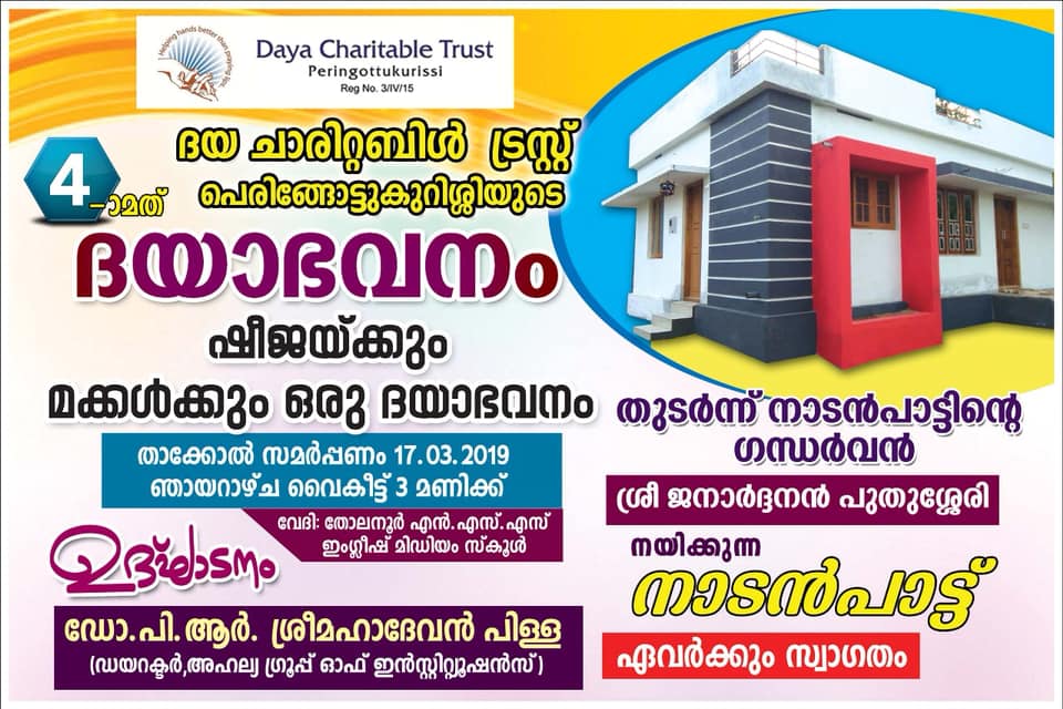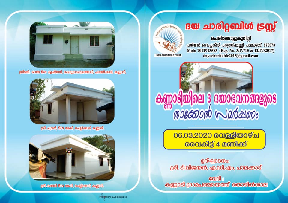 Life-Saving Support for Organ Transplants , A support to the poor kidney and liver patients whose organ is needed to transplant. As per the medical team, Daya uses the method of crowdfunding for this project as the surgery involves heavy cost. Trust terms this as Bucket Revolution for raising funds to meet the surgery and the medical expenses after surgery for a particular period. Ten Karunya Viplavams have been done in 10 different Panchayaths.